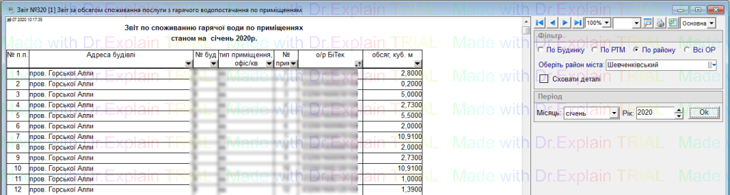 320 Звіт за обсягом споживання послуги з гарячого водопостачання по приміщенням