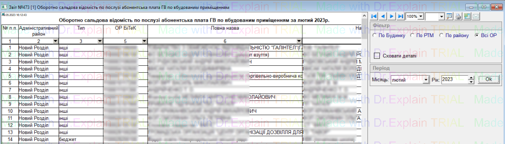 473 Оборотно сальдова відомість по послузі абонентська плата ГВ по вбудованим приміщенням