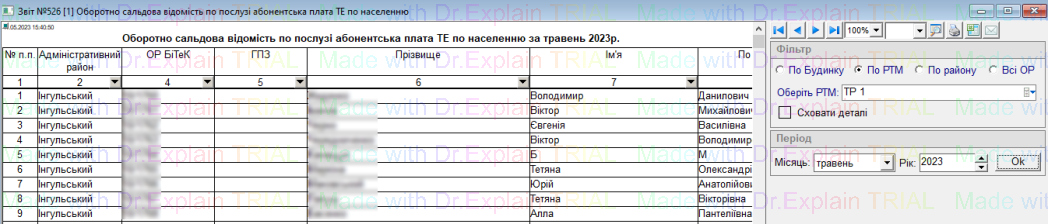 526 Оборотно сальдова відомість по послузі абонентська плата ТЕ по населенню