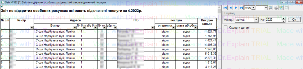 532 Звіт по відкритих особових рахунках які мають відключені послуги