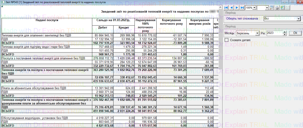 543 Зведений звіт по реалізованій тепловій енергії та наданих послугах