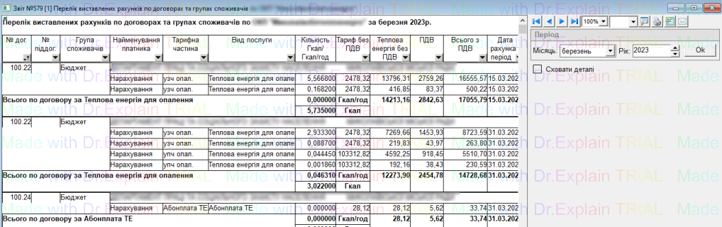 579 Перелік виставлених рахунків по договорах та групах споживачів