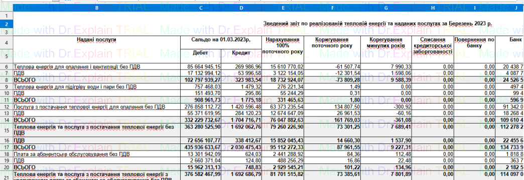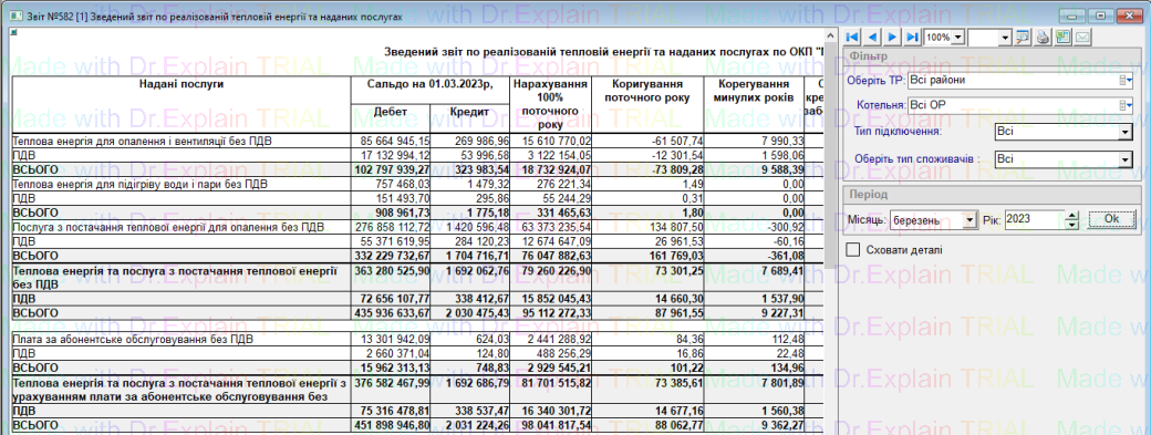 582 Зведений звіт по реалізованій тепловій енергії та наданих послугах