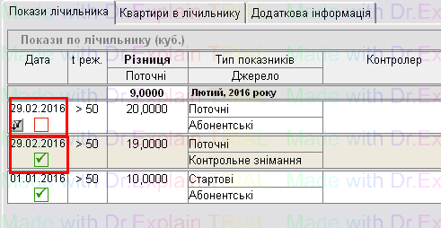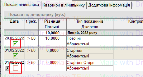 Якщо наступний показник (на наступну дату цього ж місяця) внести менший за попередній, то його буде не зараховано (позначка зліва — червоний квадратик). Зелена галочка означає що показник зараховано: