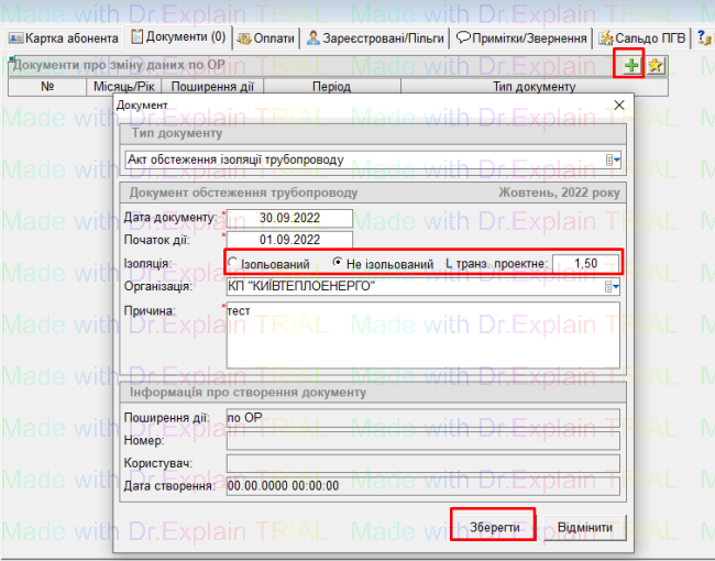 - тип документу вибрати “ Акт обстеження ізоляції трубопроводу”