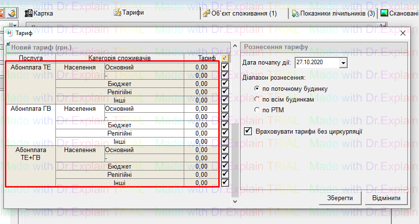 Також потрібно буде проставити тарифи по будинку по послугам: Абонплата ТЕ, Абонплата ГВ, Абонплата ТЕ + ГВ: