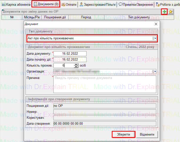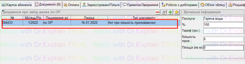 після цього у вкладці "Документи" буде відображений заведений документ "Акт про кількість проживаючих":