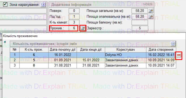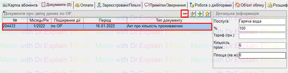 Якщо документ про зміну кількості проживаючих було заведено в минулому розрахунковому місяці, для видалення можна скористатись тут кнопкою "-" , видалення відбувається почергово;