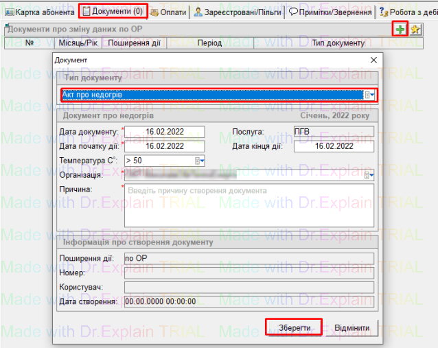 - вказати Дату початку та кінця дії документу- період надання послуги неналежної якості згідно Акту замірів;