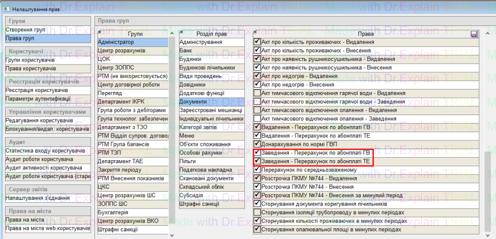 Налаштування прав для заведення актів по абонплаті