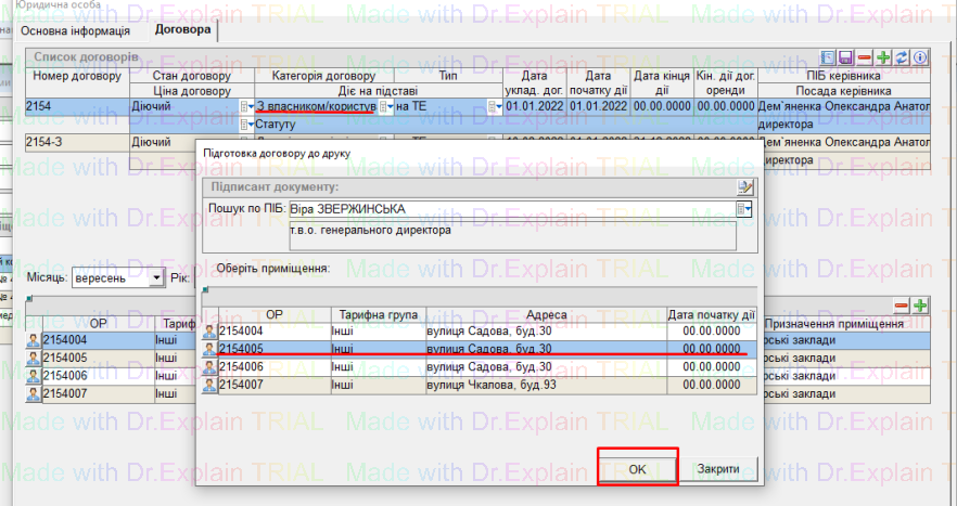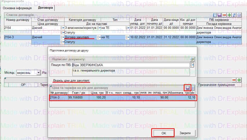 у даному вікні вибрати потрібного підписанта, та натиснути кнопку “ОК”, після цього буде сформований договір у форматі Word.