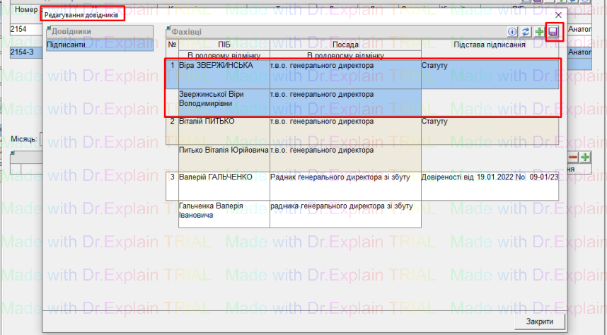 внести дані про нового підписанта та натиснути кнопку “дискета” для збереження змін: