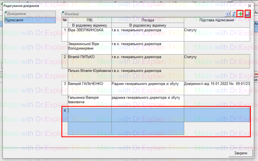 Щоб додати нового підписанта у довідник, потрібно натиснути кнопку “+”,