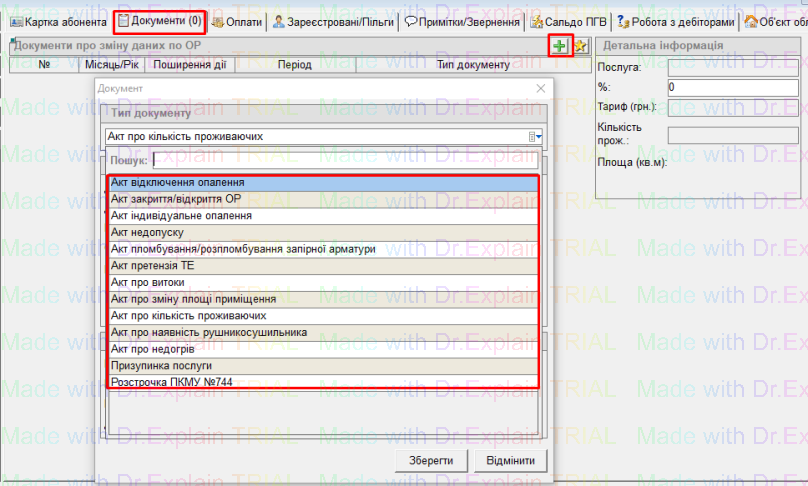 У вікні "Особові рахунки" перейти на потрібний ОР, далі на вкладку "Документи", нажати на кнопку "+" - відкриється вікно "Документ":