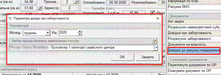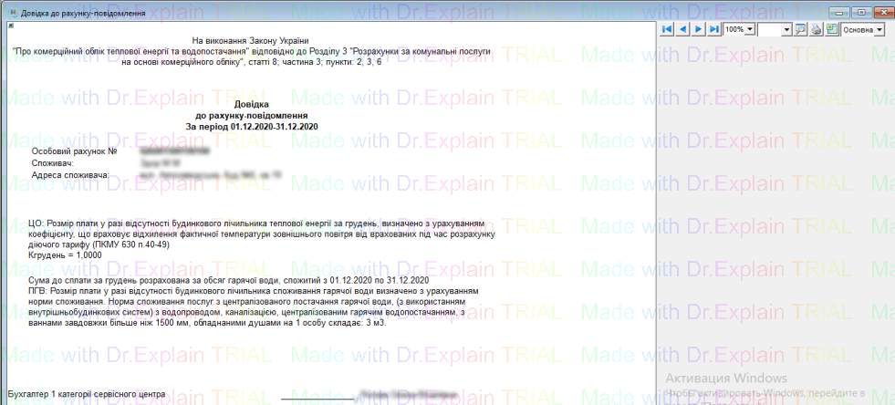 Вибрати місяць та представника, натиснкути "ОК" - відкриється довідка до рахунку-повідомлення: