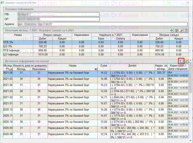 Для формування "Довідки щодо розрахунку 3% річних та інфляційних втрат", у вікні Штрафних санкцій по абоненту, натиснути кнопку виділену нижче: