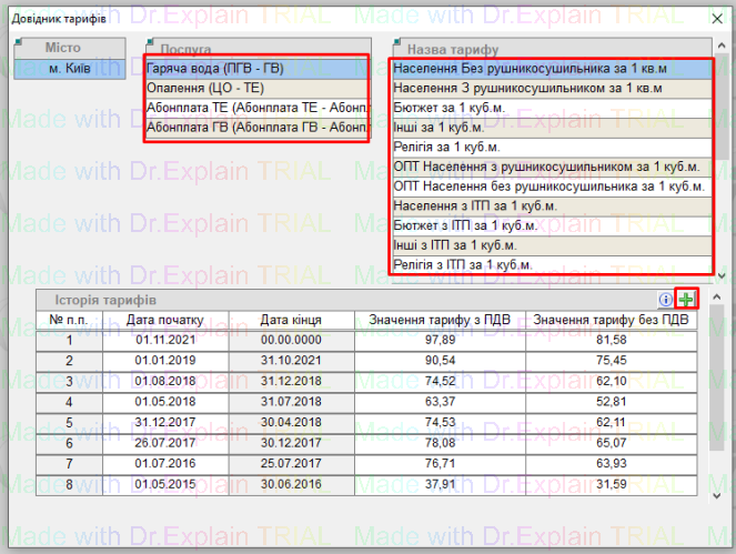 вибрати Місто, Послугу, Назву тарифу, і завести нормативний тариф через кнопку “+”