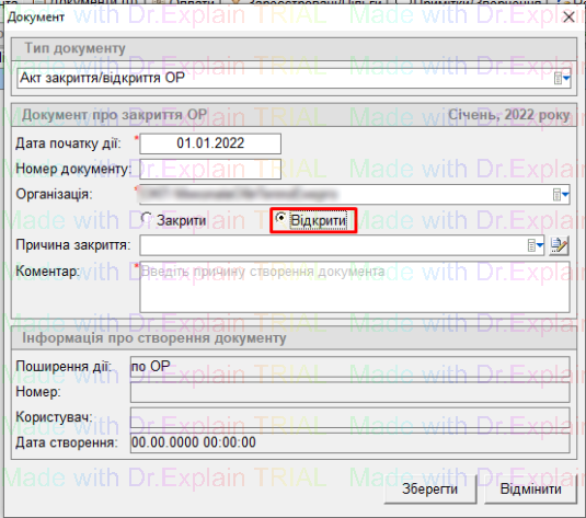 - Тпп документу вибрати "Акт закриття/відкриття ОР"