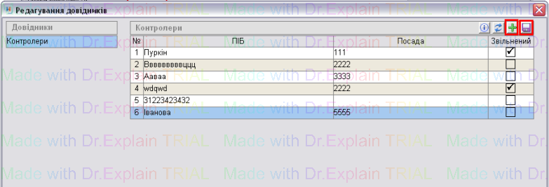 для того, щоб додати контролера у довідник контролерів, нажимаємо на кнопку "листок з ручкою", далі на знак "+", Записуємо ПІБ, посаду, далі "Зберегти" (дискета). Якщо контролер звільнений, у графі "звільнений" ставимо галочку — зберегти "дискета", далі закриваємо вікно.