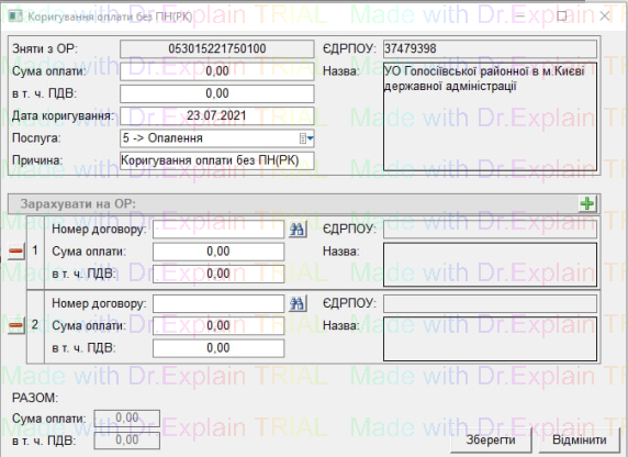 В нижній частині вікна у полі «Разом» - відображається різниця між Сумою оплати та ПДВ у блоці «Зняти з ОР» та Сумою оплати та ПДВ усіх зарахувань у блоці «Зарахувати на ОР»