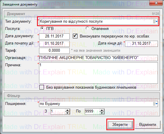 ип документу по будинку вибрати "Коригування по відсутності послуги", вибрати послугу, заповнити поля, та нажати Зберегти