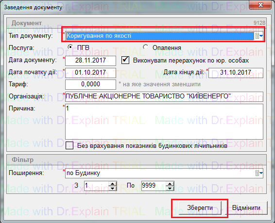 ип документу по будинку вибрати "Коригування по якості", вибрати послугу, заповнити поля, та нажати Зберегти