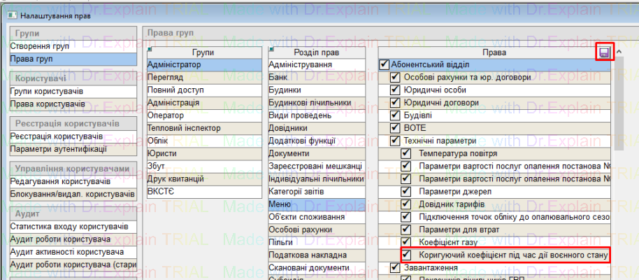 Щоб додати “Коригуючий коефіцієнт під час дії воєнного стану”, спочатку потрібно надати користувачу право: