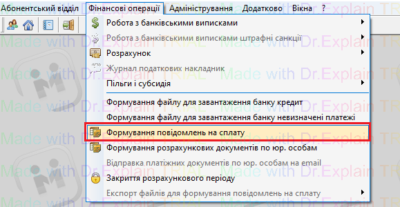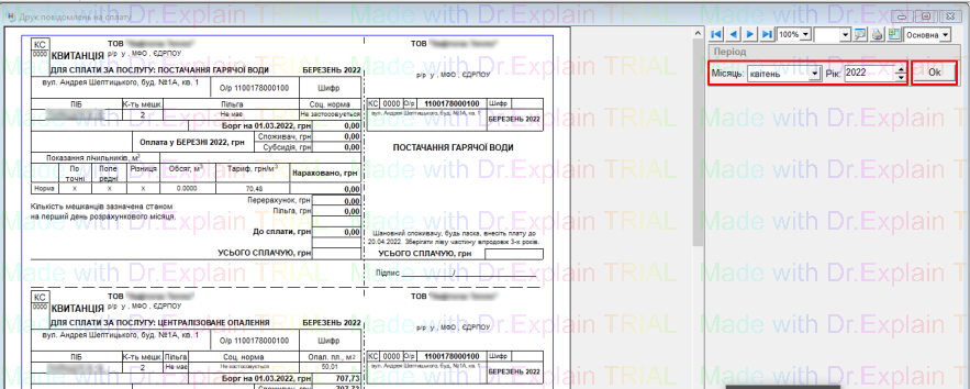 Відкриється вікно, зправа у меню можливо вибрати за який місяць потрібно сформувати квитанцію, та вибрати вигрузку в Exel або друк: