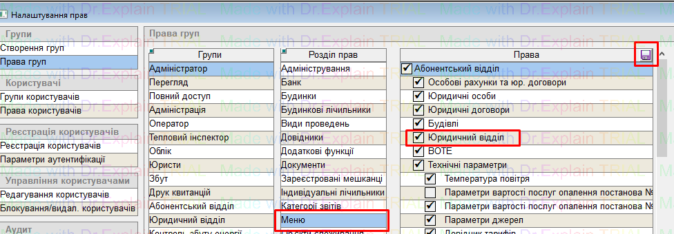 Для налаштування прав до меню «Юридичний відділ», користувачу потрібно надати такі права: