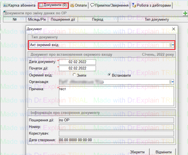 - вибрати тип документу “Акт окремий вхід”: