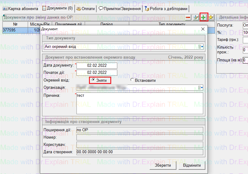 - щоб забрати признак “Окремий вхід”, потрібно завести такий же акт, тільки при заповненні Акту вибрати “Зняти”: