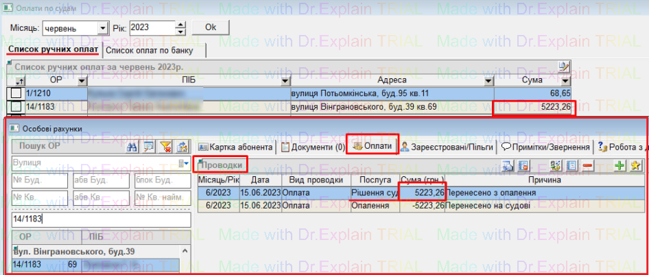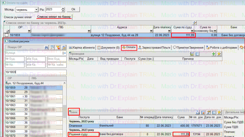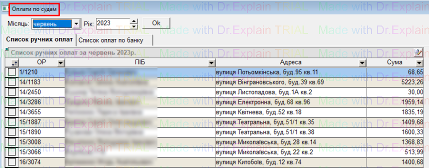 На вкладці "Список оплат по банку" відображено банківські оплати з типом послуги "Рішення суду":