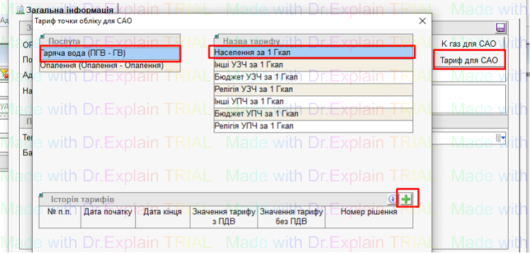 - після вибору «САО», з’являться кнопки «Тариф для САО» та «К-газ для САО»,