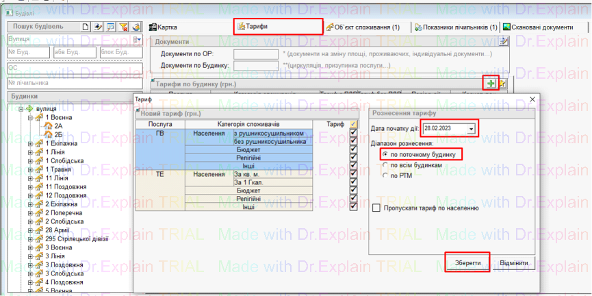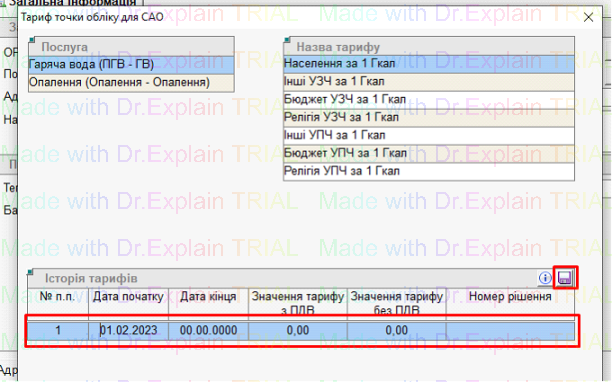 - Завести тариф, вказати дату початку тарифу, і натиснути дискету для збереження,