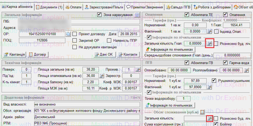 Для того, щоб побачити інформацію про показники, у картці абонента нажимаємо "лупа" біля Загальна кількість Гкал (по ЦО або ПГВ)