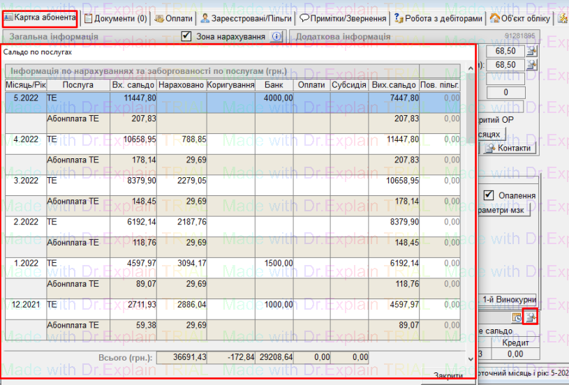 Відкрити ОР - і в картці ОР натиснути на кнопку "лупа", відкриється вікно "Сальдо по послугах", у якому інформація відображена по місяцям: