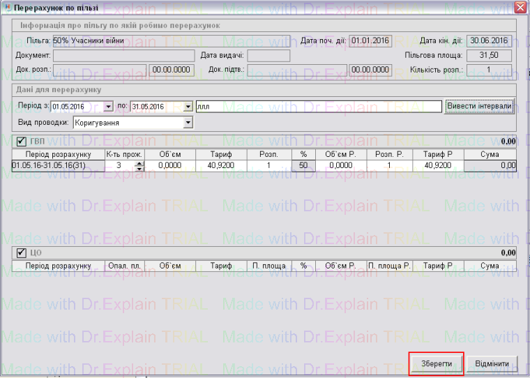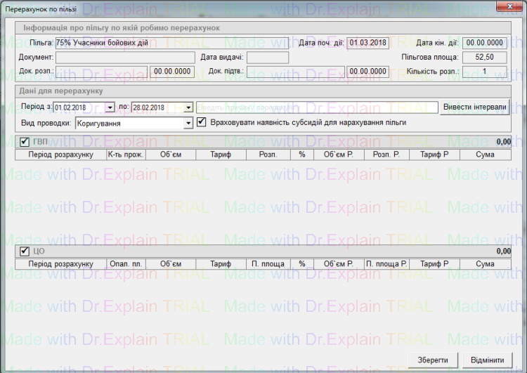 У вікні для перерахунку по пільзі автоматично підтягується інформація що заведена по пільзі: назва пільги, документ на пільгу, пільгова площа, дата початку дії та інше.