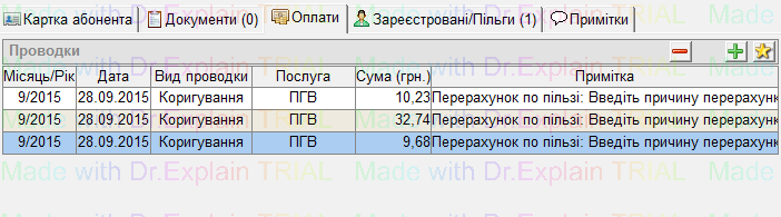 Щоб перевірити проводки, заходимо: Абонентський відділ→ Особові рахунки (знаходимо необхідний, ввівши потрібні дані)→ переходимо на вкладку "Оплати" :