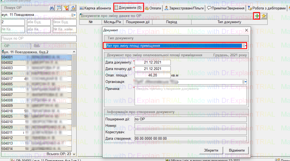 - спочатку змінюємо площу по потрібним особовим рахункам завівши “Акт про зміну площі приміщення” за попередній місяць: