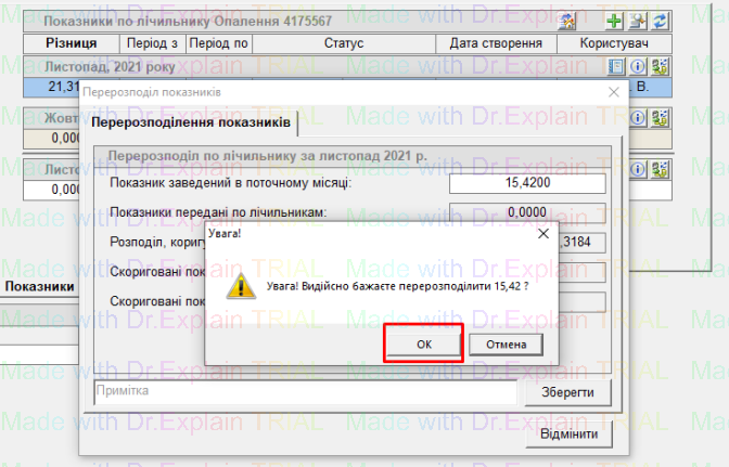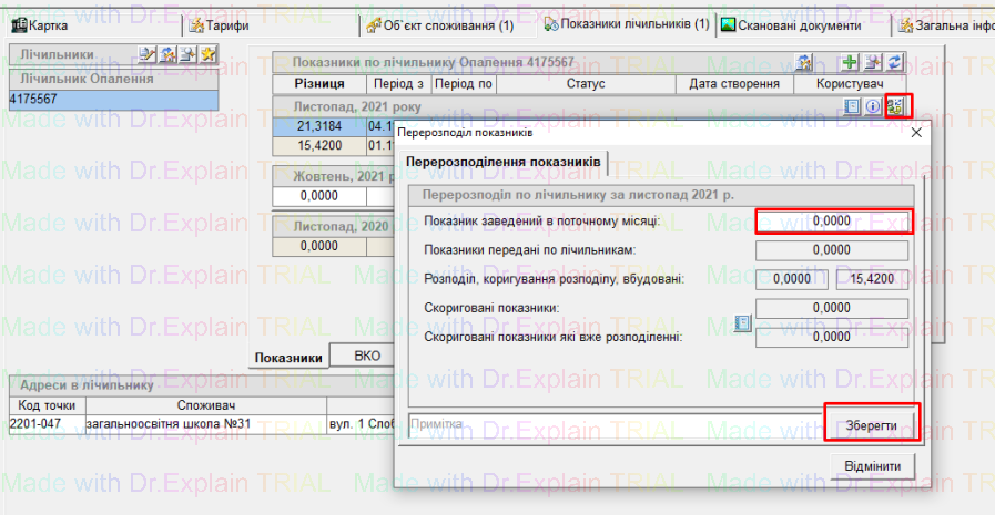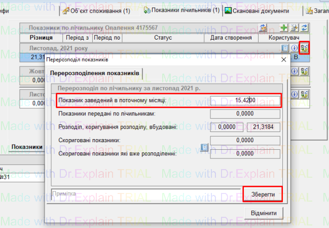 - у полі “Показник заведений в поточному місяці” вказати показник який потрібно перерозподілити, і натиснути Зберегти: