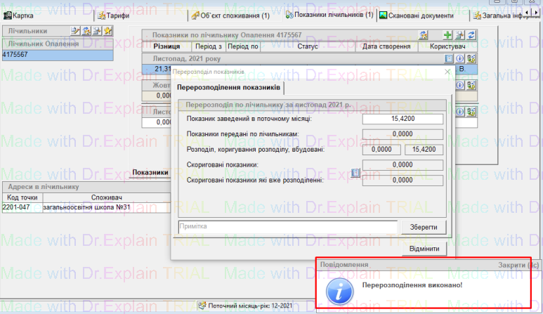 - у повідомленні “Ви дійсно бажаєте перерозподілити?” натиснути ОК, знизу відобразиться повідомлення що Перерозподіл виконано: