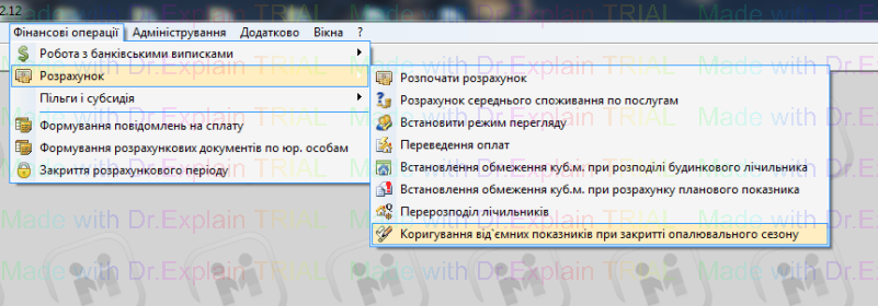4. перейти Фінансові операції — Розрахунок — Коригування від'ємних показників при закритті опалювального сезону