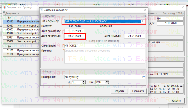 1. По будинку завести документ “Акт переведення на 830 постанову” з датою початку дії — перше число поточного місяця: