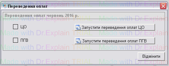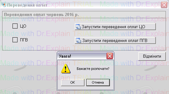 щоб запустити переведення оплат по ЦО, нажимаємо на потрібну кнопку, і відкриється вікно для підтвердження дії, нажати "ОК". Після чого біля "ЦО" з'явиться галочка.