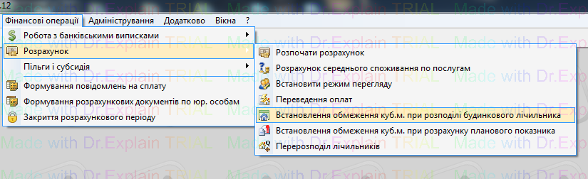 Для того щоб встановити обмеження куб.м при розподілі будинкового лічильника, заходимо в меню Фінансові операції — Розрахунок - Встановлення обмеження куб.м при розподілі будинкового лічильника
