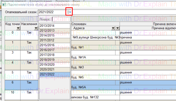 Для перегляду інформації по різним опалювальним сезонам, скористатись кнопкою у полі “опалюваний сезон”: