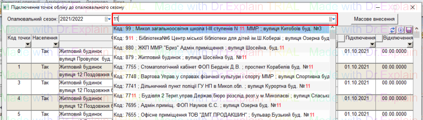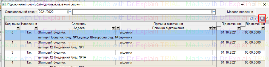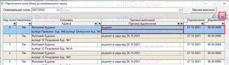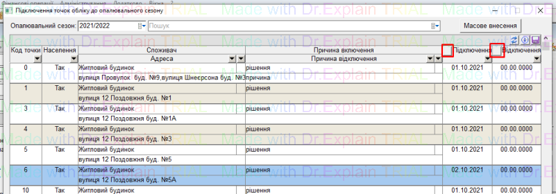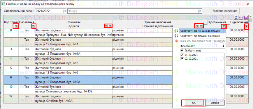- також у колонках є фільтри, можна відфільтрувати список точок обліку, і потім рознести дату підключення/відключення по відфільтрованому списку, і натиснути “дискету” для збереження: