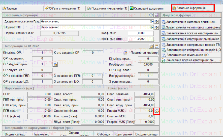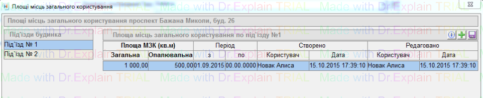 У блоці "Площі" є значок "Дім", нажати на нього, відкриється вікно — "площі місць загального користування".