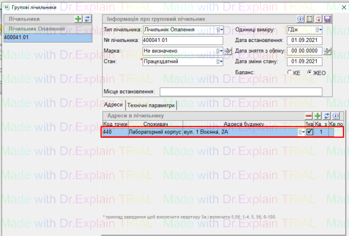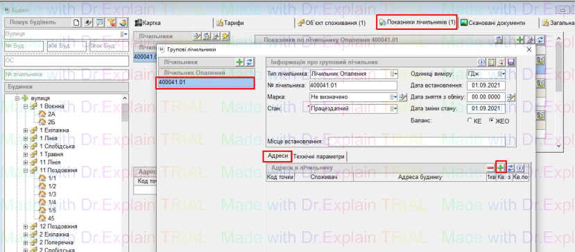 і вибрана Точка обліку буде відображена у вкладці “Адреси”, і на вкладці “Показники лічильників”: