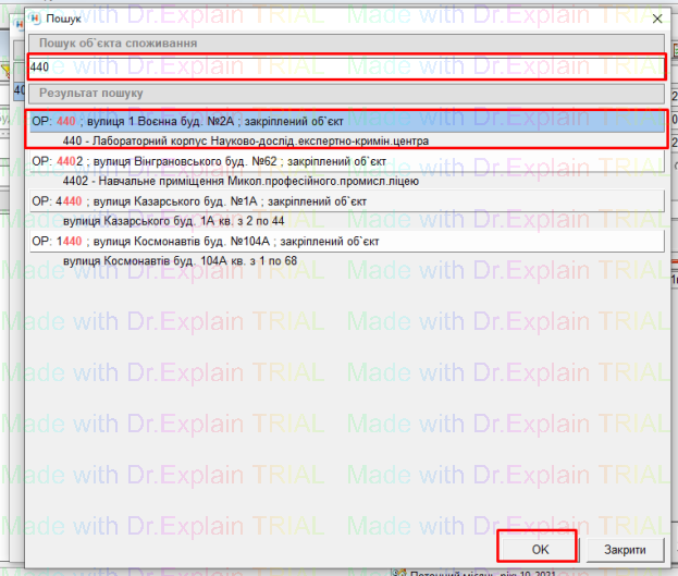 - відкриється вікно “Пошук”, у якому у поле для пошуку вводимо код точки(Об’єкту споживання), вибираємо потрібний запис і натискаємо “ОК”: